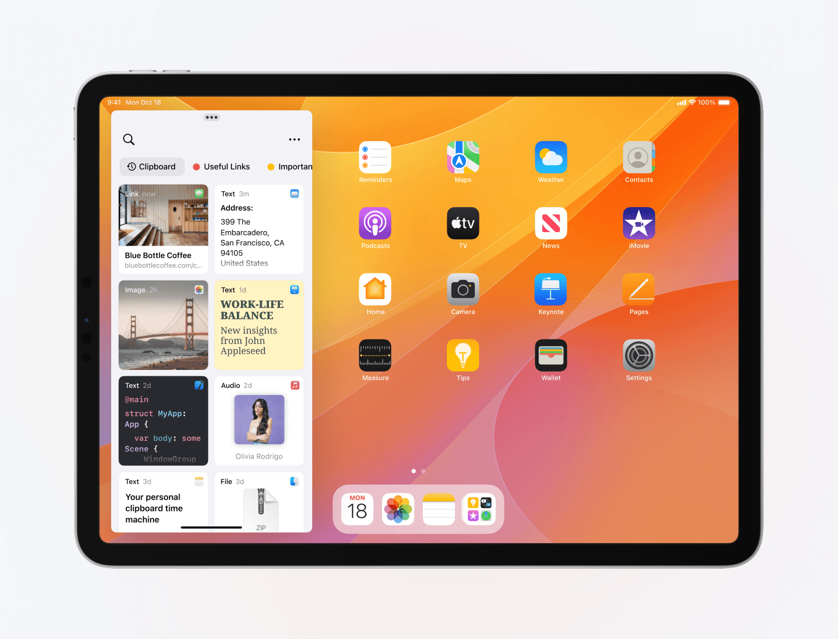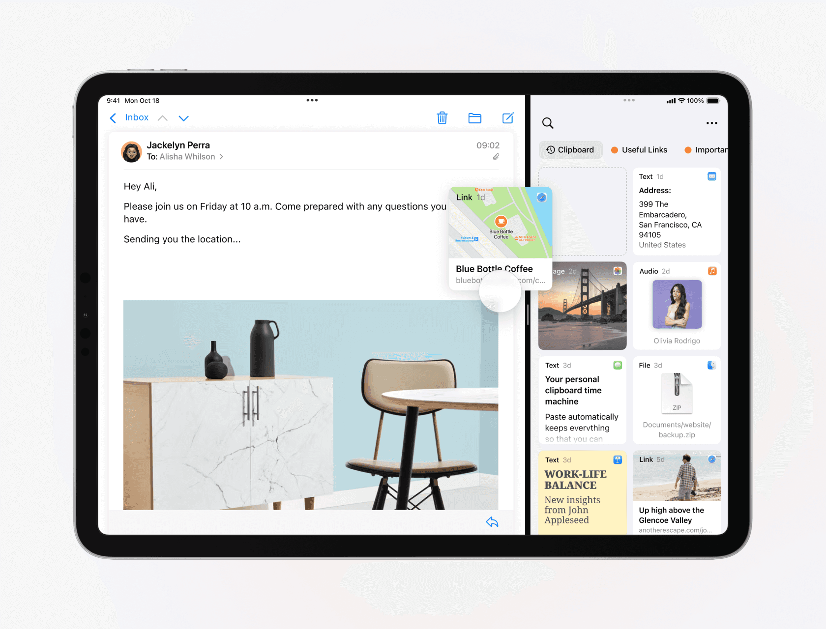 Just like the Stage Manager, Split View, and Slide Over modes enable you to manage multiple applications on your iPad, allowing you to work seamlessly with Paste. In this mode, Paste automatically captures your clipboard content, making it simple to paste items directly into other applications and drag-and-drop data to and from Paste.