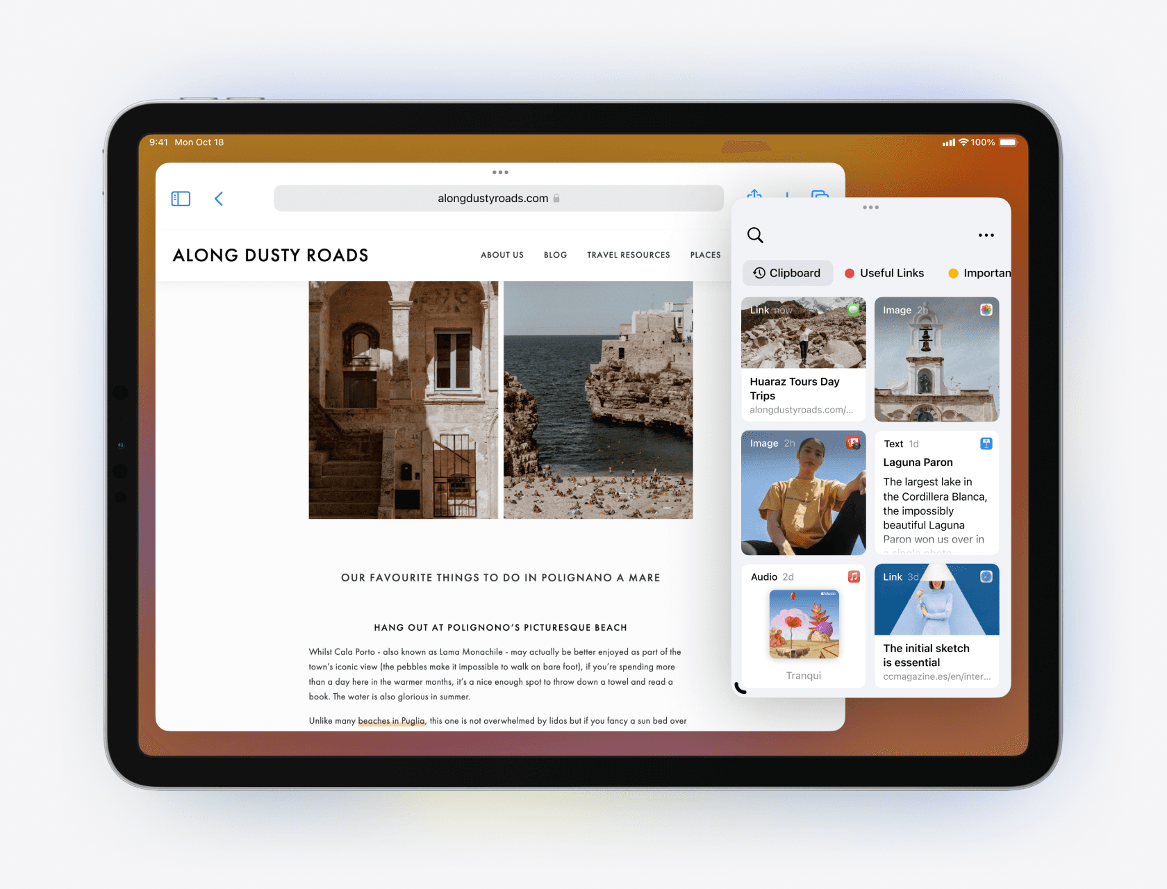 Using Paste on your iPad in combination with Paste on your Mac can be incredibly beneficial. To make the most of Paste on your iPad, we recommend using the Paste Keyboard and the Action & Share Extension. If you’re already using Paste on your iPhone, you’ll find it easy to get started on your iPad as well.