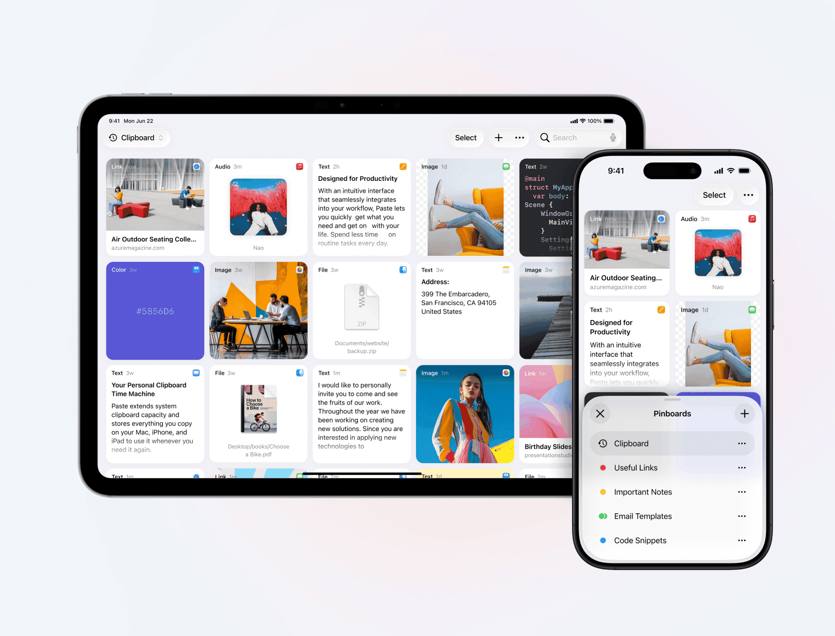 Paste on iPhone works together with Paste on Mac and iPad, keeping your clipboard history and pinboards in sync.
