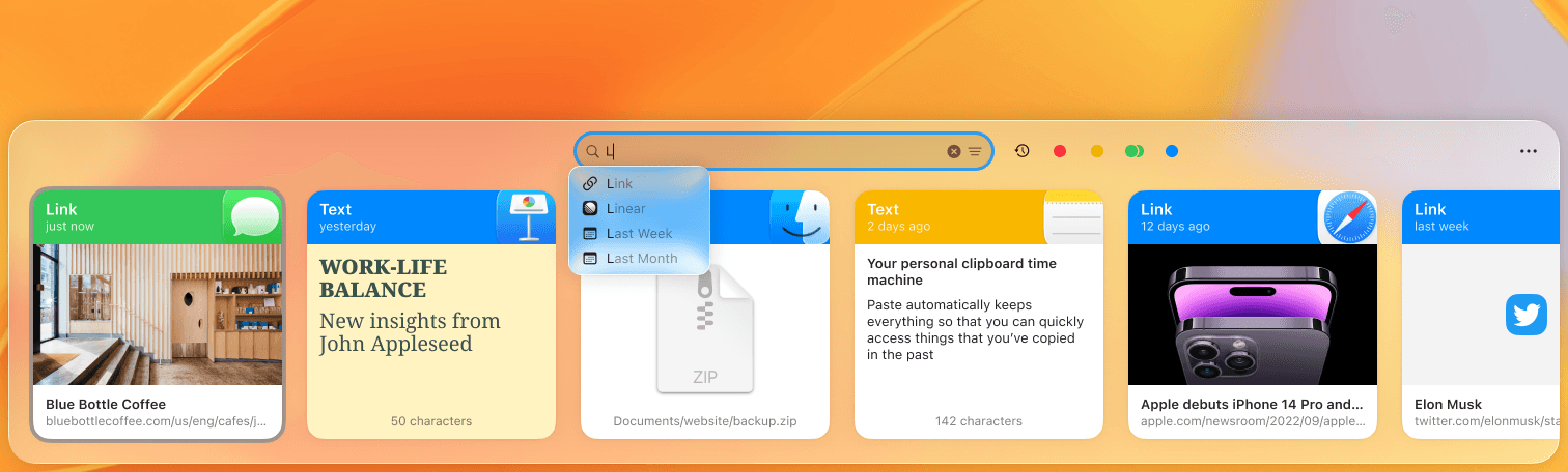 Search in Paste is designed to stay out of your way while helping you move faster. You can find a link by typing part of its title and letting filters narrow the results, locate a code snippet by filtering to the app it came from, or bring back a screenshot by searching for text visible inside the image itself.