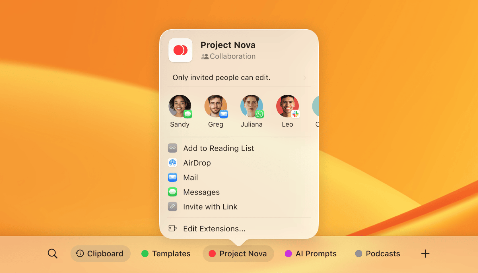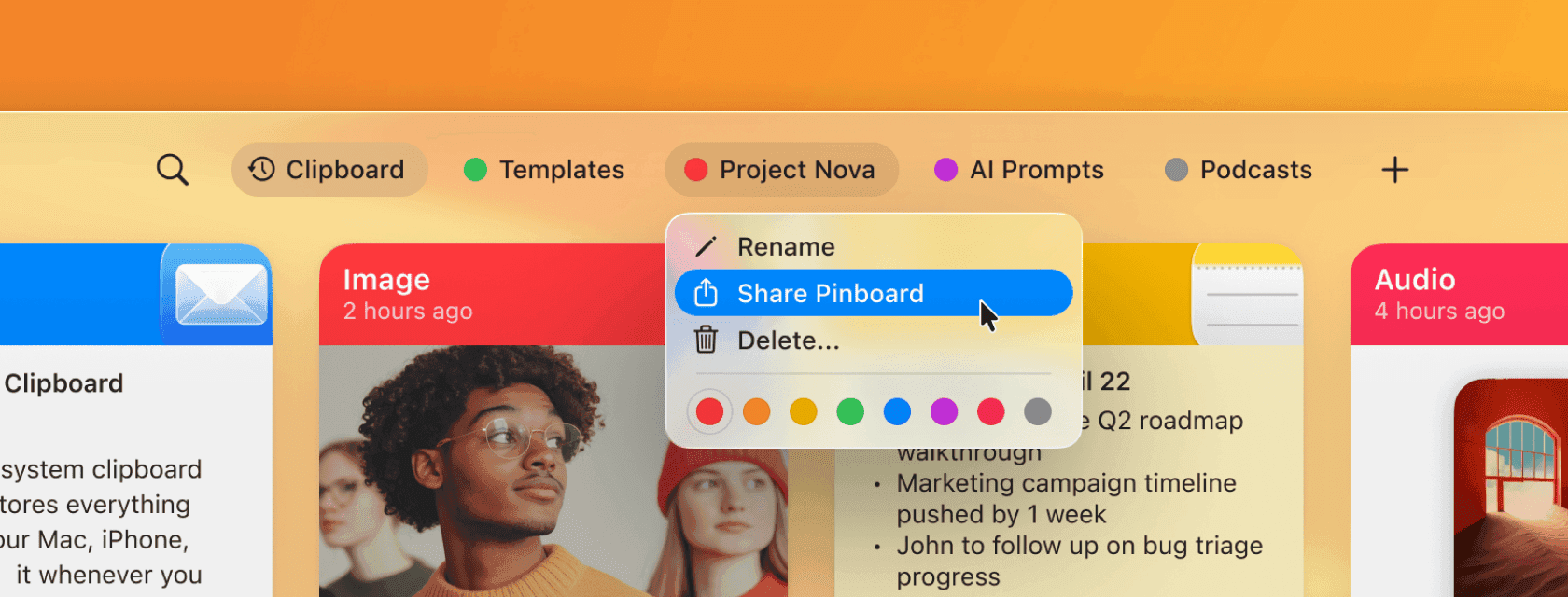 Shared Pinboards make collaboration in Paste simple—whether you’re gathering ideas, saving references, or organizing project materials. You can invite others to work together with you, all in one shared space, on both macOS and iOS devices.